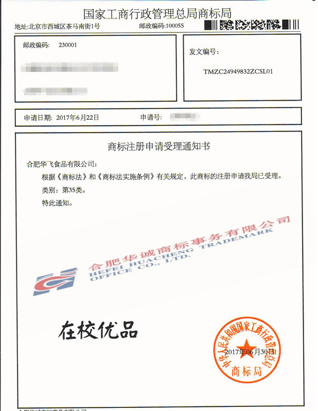 您委托我所代理商标注册申请,名称为“在校优品”35类商标已被国家商标局受理。