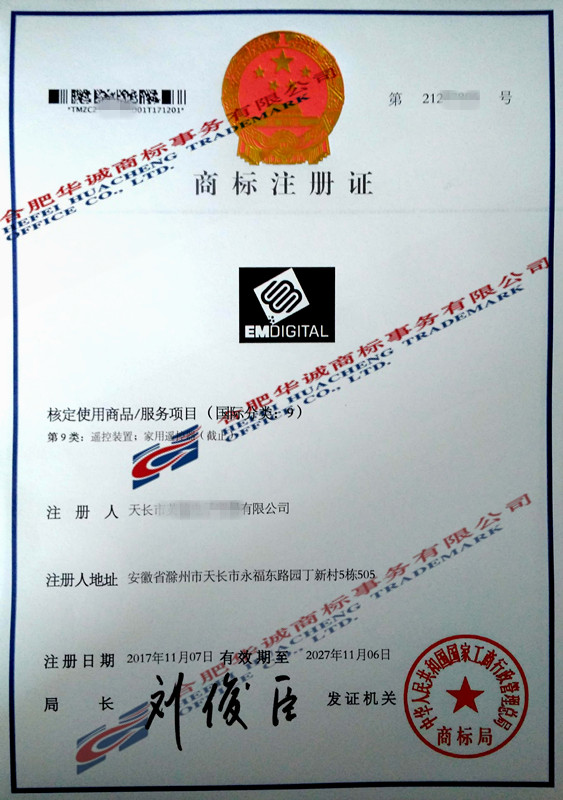 您委托我所代理商标注册申请,名称为“EMDIGITAL” 9类商标注册证已下达。