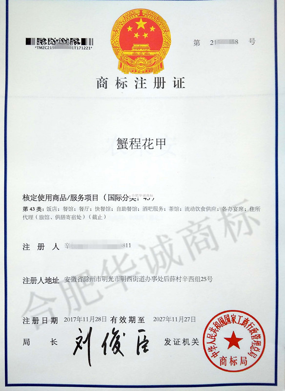 您委托我所代理商标注册申请,名称为“蟹程花甲” 43类商标注册证已下达。