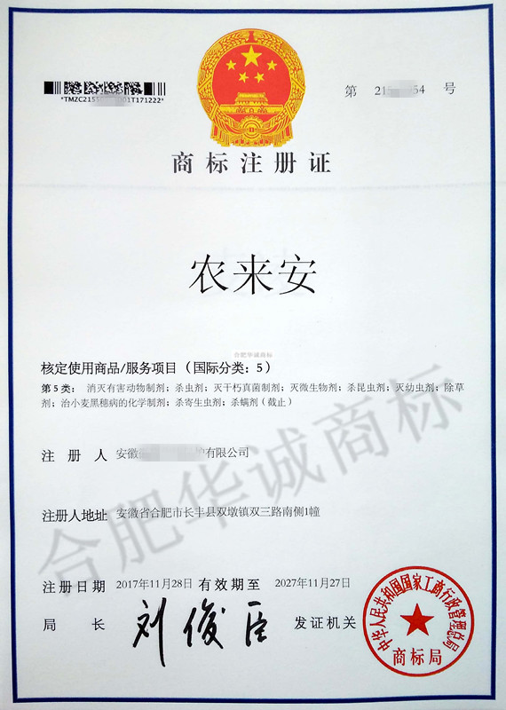 您委托我所代理商标注册申请,名称为“农来安” 5类商标注册证已下达。