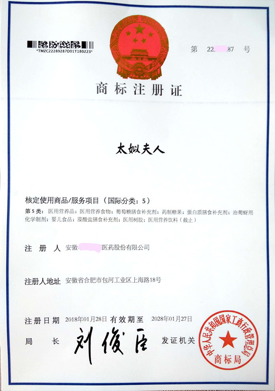 您委托我所代理商标注册申请,名称为“太姒夫人” 5类商标注册证已下达。