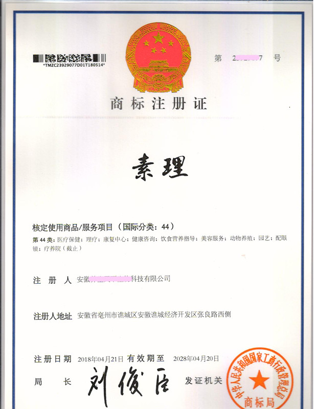 “素理”44类商标注册证下达