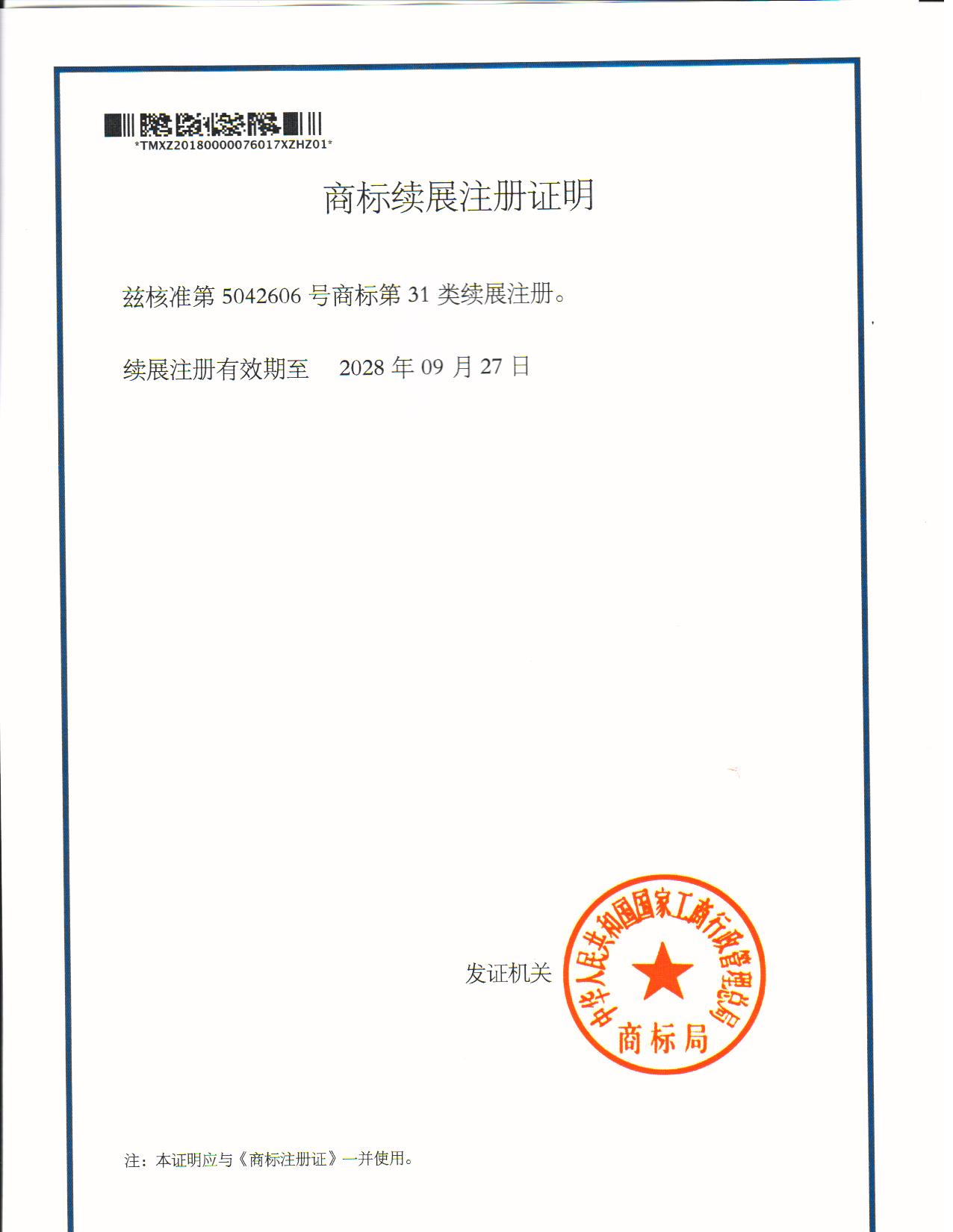 第“5042606”31类商标续展注册证明下达