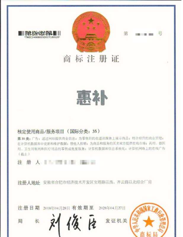 “惠补”35类商标注册证下达