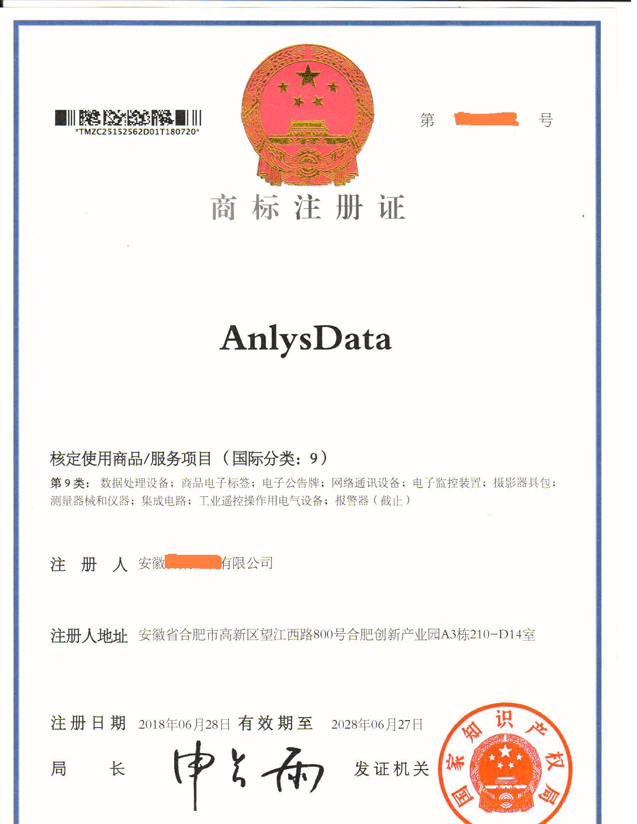 您委托我所代理商标注册申请,名称为“AnlysData”9类商标注册证已下达。